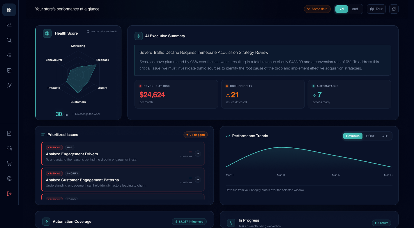 The platform combines sales, behaviour and marketing data so store owners can understand which products, funnels and campaigns drive profit, and which ones quietly drain margin. Insights are presented in a simple dashboard with clear next steps instead of raw numbers.